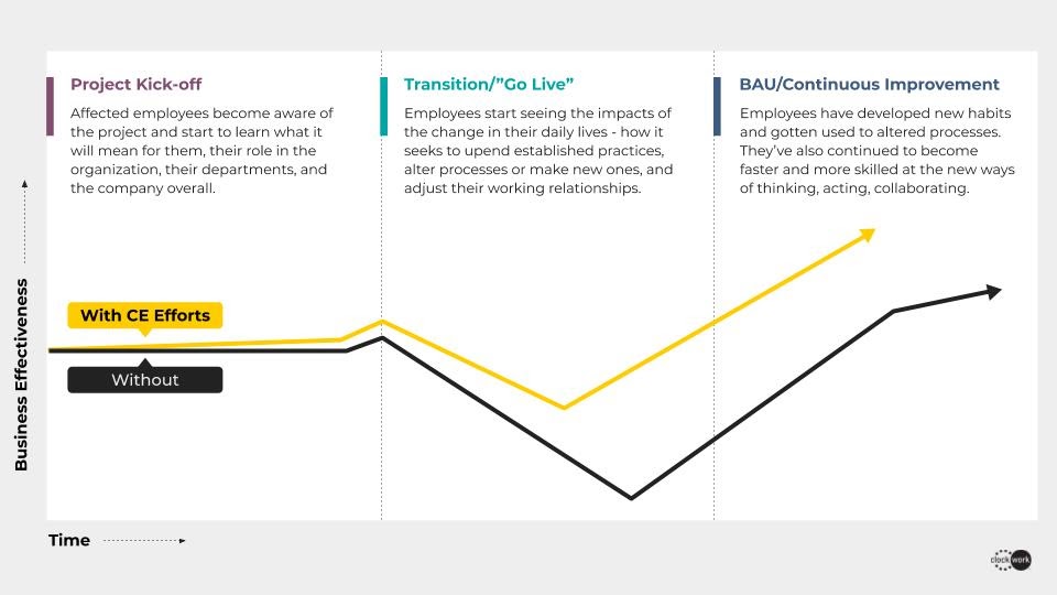 Change enablement techniques will make the difference. With efforts to make people aware of, eager, and ready for their role in adopting a new way of working, healthcare organizations reduce the productivity dip (and possibly the flight risk) that comes with change. Without change enablement practices, organizations can expect a much slower (and possibly less robust) return on investment.